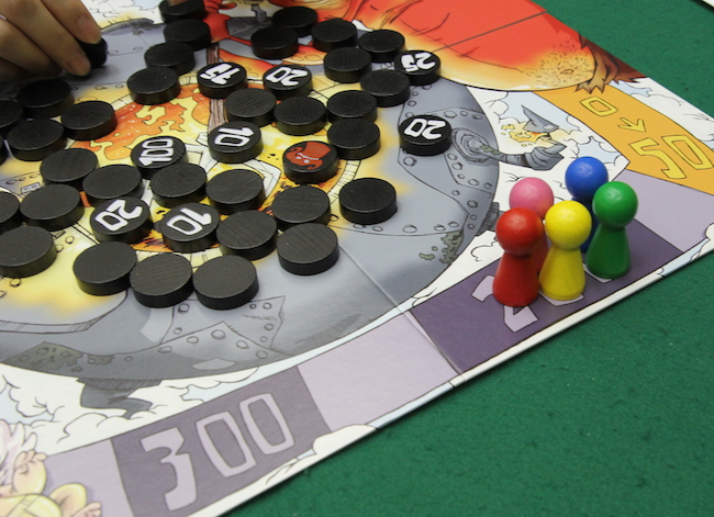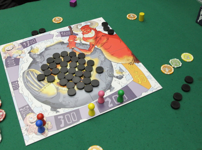 賭けの成功、失敗以外にもボーナス点みたいなのもあって もっとも多い枚数の石炭チップをめくったプレイヤーとか、めくった石炭チップの数字の合計が最大とか それぞれ50点もらえます。 あと、ビリの人への救済措置もあって、得点トラック上で単独最下位のプレイヤーが居る場合は 悪魔チップをめくってしまうと、最下位のプレイヤーに得点チップを献上しなければいけないとか だいたいそんな感じかな。