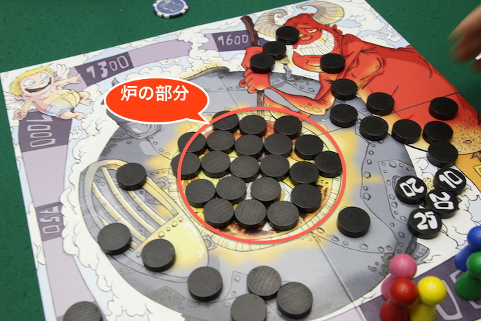 このとき、釜の炉の絵(火が噴き出している部分)の上に残ったチップが置ききれない場合は 前のラウンドでめくったチップは戻さず、そのまま次のラウンドに入ります。 ラウンド終了時に、残った全ての石炭チップが炉の上からはみ出さずに置けたら それまでに使用した石炭チップをボード上に戻します。