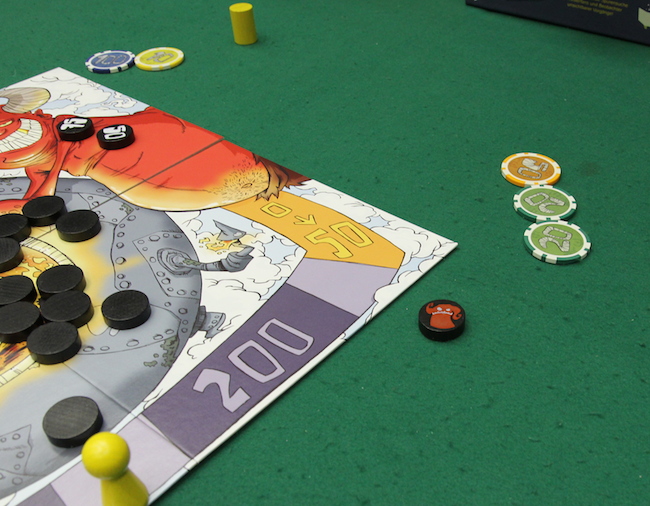 最初は全員持ち点200なので、200のマスからスタートします。 で、ゲーム中の持ち点の変化に合わせて得点トラックのコマも動かしますが 例えば、持ち点が230点なら得点トラックのコマは200と300の間のグレーのマスに置きます。 300ピッタリなら300のマス。300を少しでも超えたらさらにその先のマス・・・という具合に 得点トラックには、各プレイヤーのおおよその得点が反映されます。 で、もちろん、これらの得点チップをなるべくたくさん獲得することを目指すのだが 最初にポーカーみたいな感じで、得点チップをビットします。