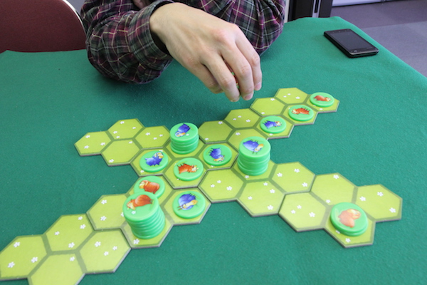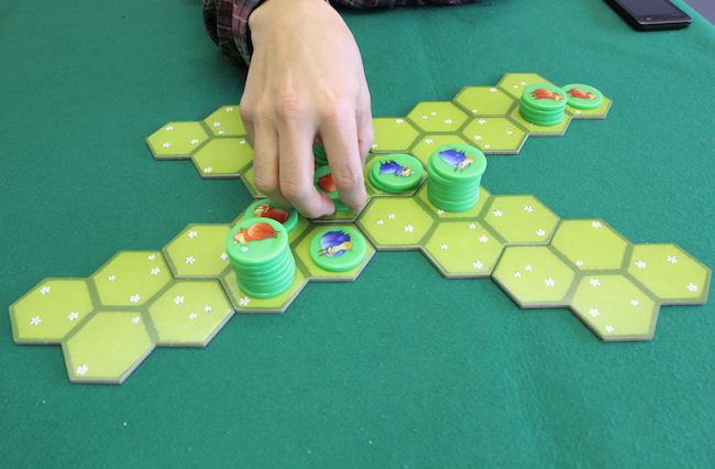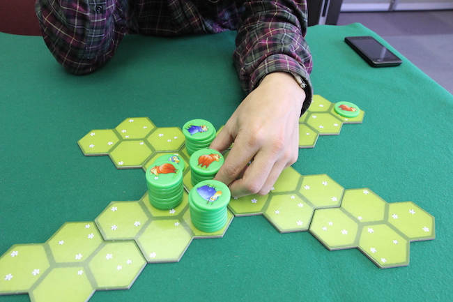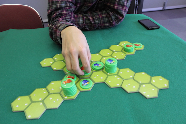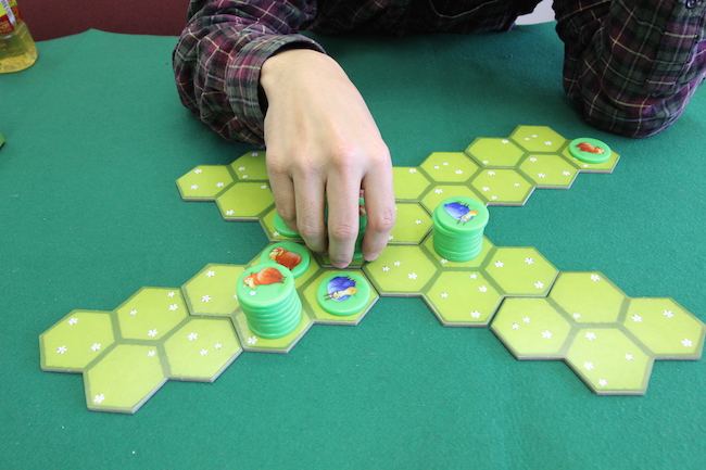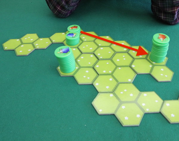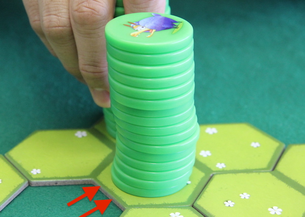 ※ボードの端のマス(テーブルに接している部分が1箇所以上あるマス)に置きます。 手番が来たら、自分のスタックから任意の枚数を取って、スタックの置かれているマスから直線的に動かします。 ただし、ボードの端か他のチップ(スタック)が置かれているマスにぶつかるまで止まれません。