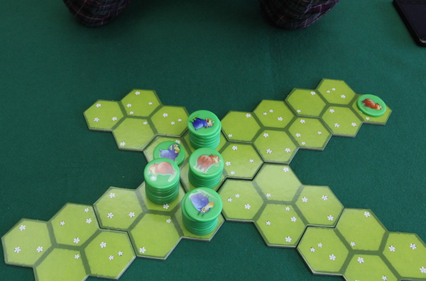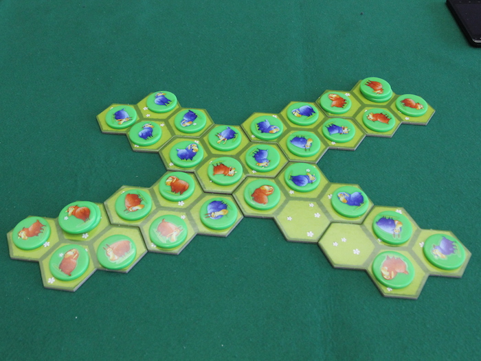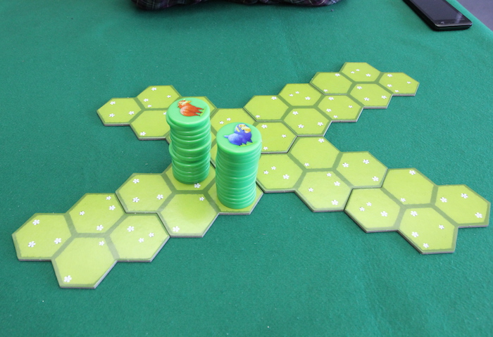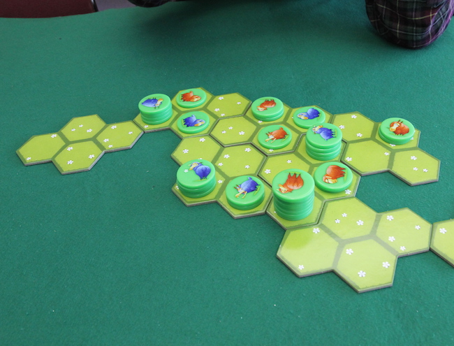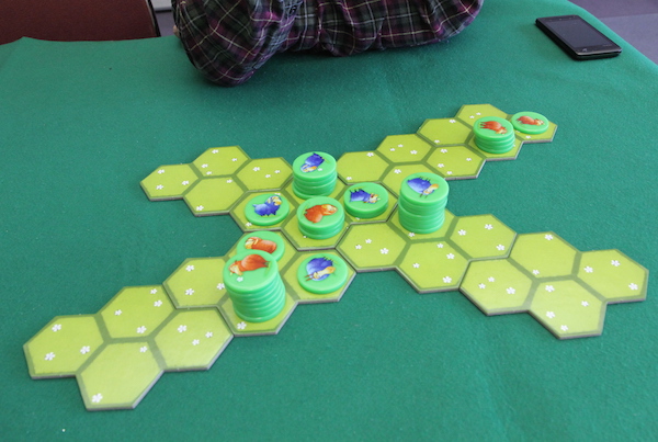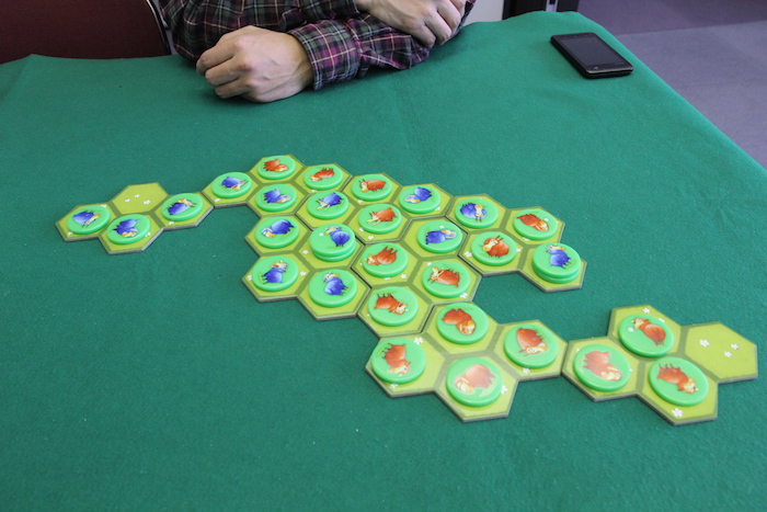 たしかに見た目もルールもオイそれはオレの魚だぜ!と良く似てるけど、遊びやすさはこっちの方が上かな。 というのも、タイルが4マス分になっててしかもタイルを並べるところからゲームになってるのでセットアップが非常にラク。 けど、実際やってみるとけっこうプレイ感が違う。 コマかチップを重ねたものになってるのか、タイルを取るかどうかという違いはあるけれど でも移動元のマスにチップを残さなければいけない、かつチップが置かれているマスには侵入できないことを考えると オイそれはオレの魚だぜ!と、基本的には同じようなシステムに思えてくる。 じゃあ違いは?と言えば、1マスの価値が同じ(本作)か1〜3点(俺の魚)かというのと スタックにどの程度のチップを入れておくか考えなきゃいけない点。 あくまで好みの差かな?と思うのだけれど、点数には多少偏りがあった方がこういう感じのゲームなら面白いのかなと感じるのと せっかく広い陣地を取れても、その広いエリアに十分置くだけのチップが無いというのはちょっとストレスかも。 取れたら取れただけ点数になった方が好みかな・・ で、ちょっと見逃してたことがあって たしかに直線的にしか進めないし、タイルが無いところとか他のチップが居るところは通り抜けられないんだけど 途中で止まれるかどうかっていう差もあるんだよね。 これ、改めてちゃんと考えるとプレイ感にかなり影響を与えてる気がしてきた。 それくらいゲームの根幹に関わるところなわけで、でもしばらく分からなかった。 これも、単純に途中で止まるっていう選択肢もあった方が好きかなぁ〜って なんとなく、俺の魚の方がのびのびと手を考えられる感じがするから。 とりあえず、本作の方が取り得る手に対する制約がすこしキツイように思う。 それをどういう風に捉えるか感じるか、ということでしょうか。 2015/04/05ツイート