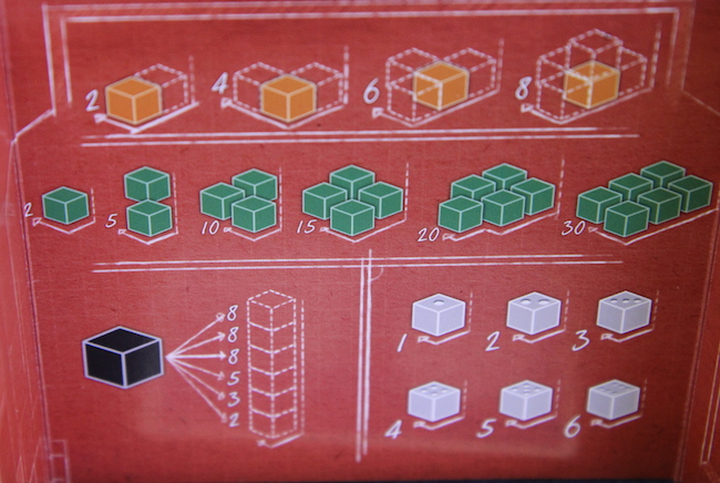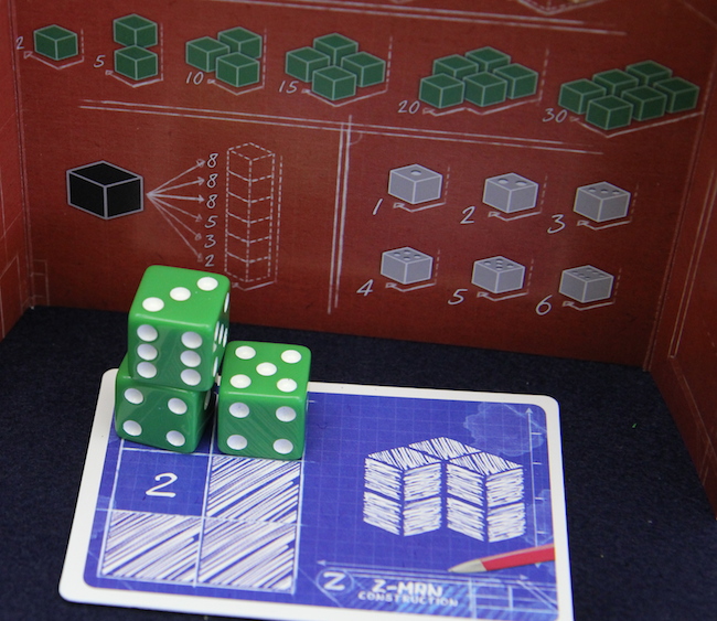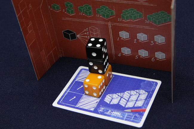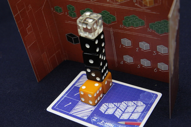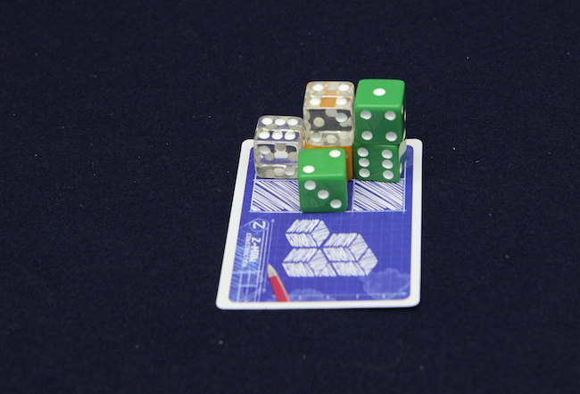 オレンジのサイコロなら、隣接して置かれているサイコロの数が多いほど高得点 緑のサイコロはできるだけ多く使っていると高得点(6個全部緑なら30点です) 黒いサイコロは、高い場所に置かれているほど高得点 そして透明のサイコロは、サイコロの出目そのものが得点になります。 で、黒いサイコロの建築資材なら、高い構造物であるほど高得点になりやすいので