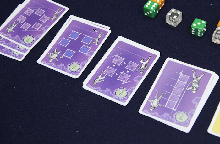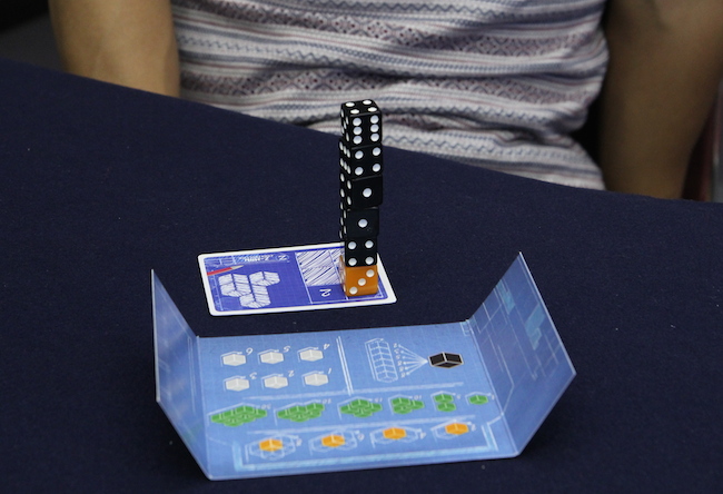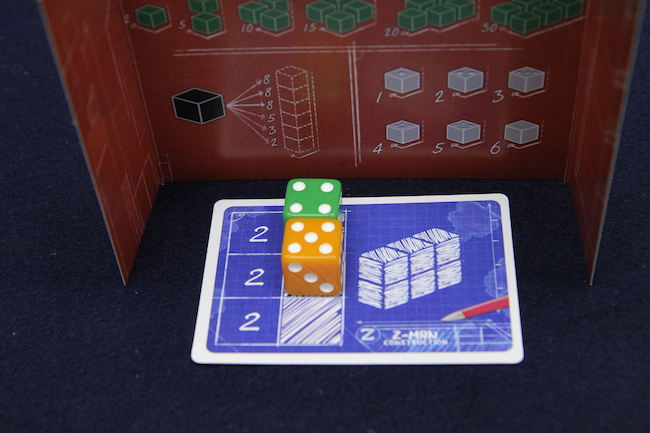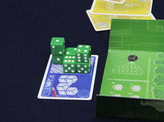 4種類(4色)のサイコロを6個使って建築物を造ります。なので、サイコロは建築資材という位置づけなのだけれど そういう感じは残念ながら無いですね^^; ラウンドの最初に、建築地を表すカードを1枚ずつ受け取って衝立の後ろに置きます。 で、1回の手番で1個サイコロを取って積んでいきます。