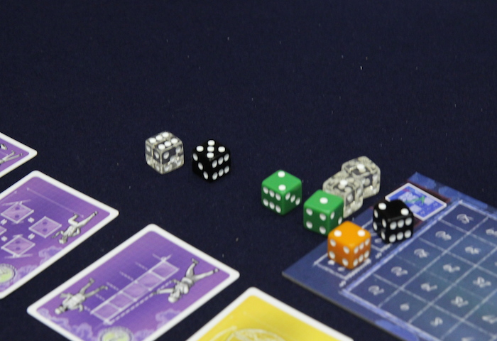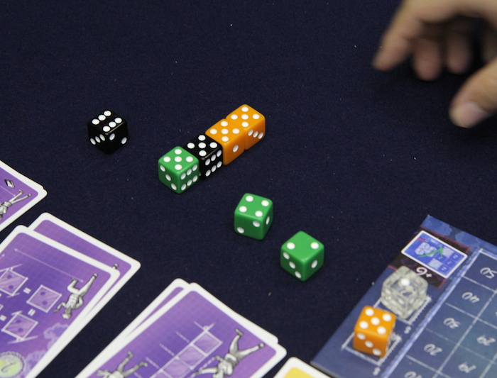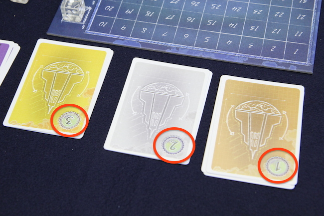同点の場合は、ボード左端に置かれた色のサイコロを使っているプレイヤーの順位が上になります。 そして、それ以外にも1〜6まで全ての目のサイコロを使ったプレイヤーは追加の勝利点カードがもらえるとか