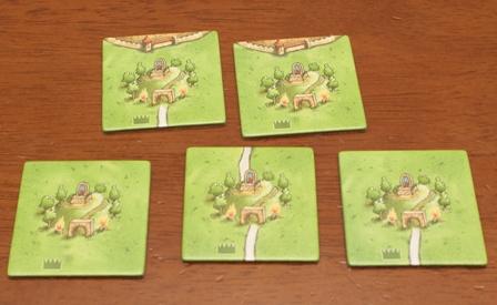 この拡張セットは、小箱でちょこちょこ出されていた拡張セットをひとまとめにしたものです。 とりあえず、「カルカソンヌの領主」。こんなタイルが12枚入ってます。表返すと、カルカソンヌ(南フランスに実在する都市)ですw