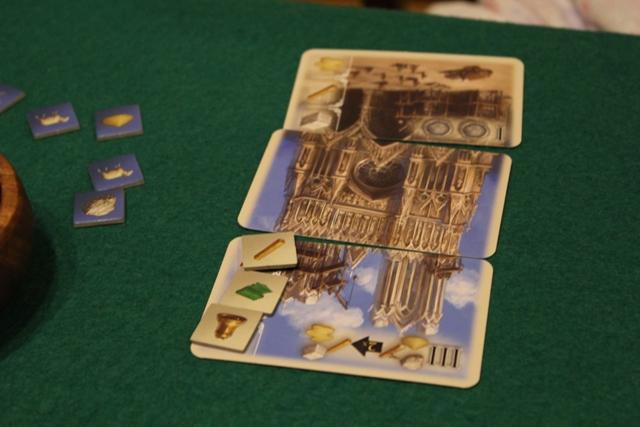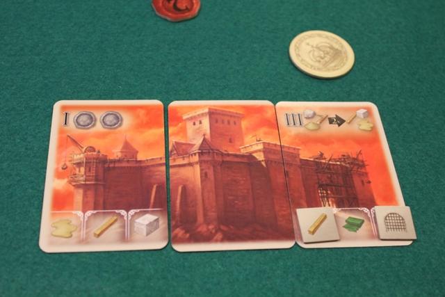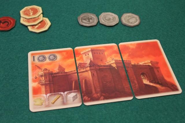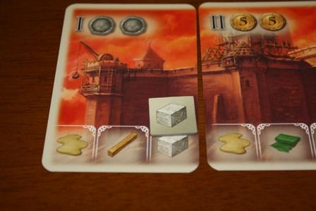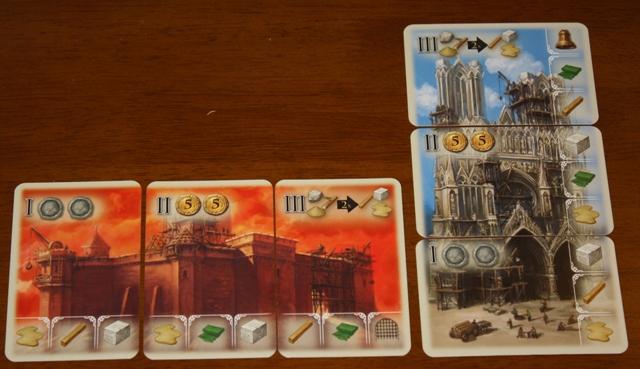 2人専用の対戦型ゲームで、それぞれ建物の建築を競います。お城(赤い方)と大聖堂(青い方)、それぞれ3ブロックに分かれている。 建物はブロックごとに、完成したらカードをひっくり返していく