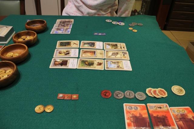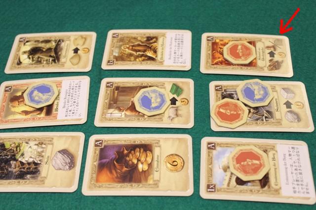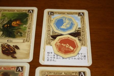 相棒「でも建築にはお金かかるでしょ」 相棒「お金無いんだよねー」 なるほど、まだ若干勝ち目あるかな? 次、後手番の俺は、是が非でも砂(右下のカード)をゲットしたいので チップはもうこう置くしかなかった。