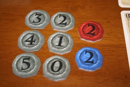 このアクションカードがどちらのものになるのかを決めるのが さっき保留にした紋章というやつで これが紋章。青と赤はそれぞれのプレイヤー専用のチップで灰色のが共通で使えるチップ。