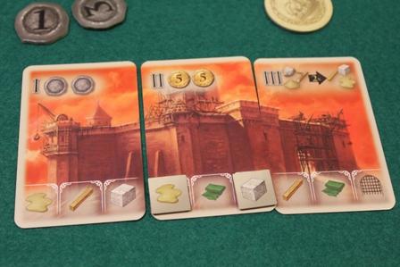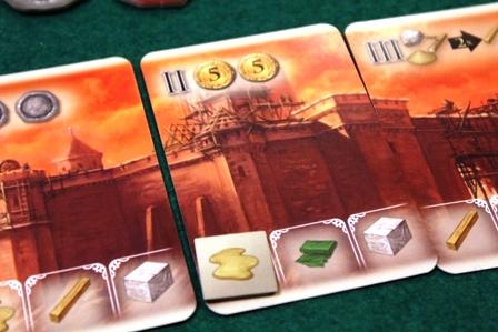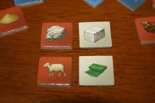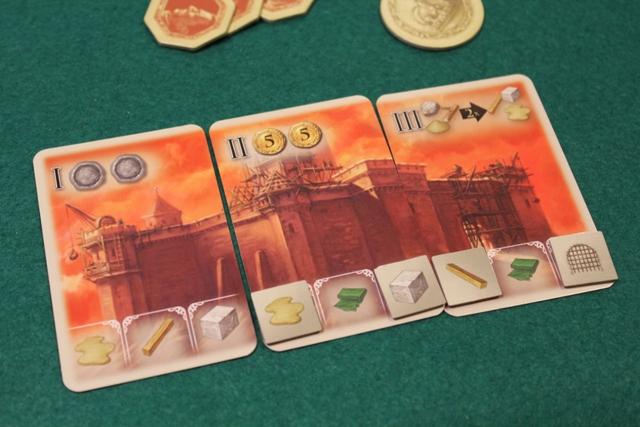 石を加工して石材に、羊を加工すると布になる。 つまり ①原料を獲得する ②原料を加工して資材にする ③資材を使って建築する 建築はこの3ステップで成り立っている。 建物は1ブロックにつき決められた資材が3つ必要で さっきの③の工程で、資材を建物カードの上に置いていき、3つ揃ったら そのブロックが完成する。