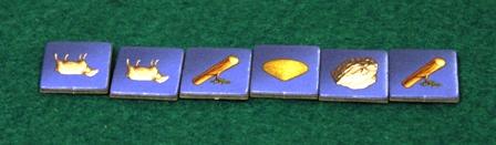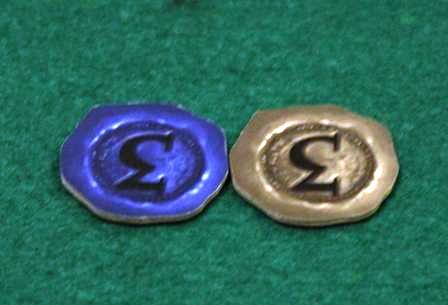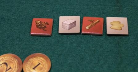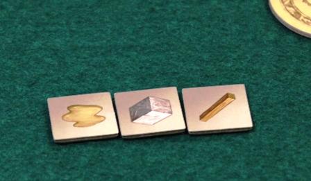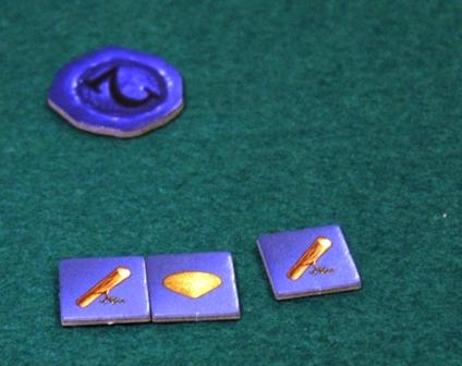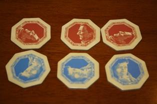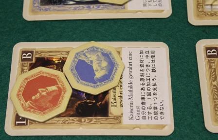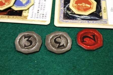 紋章はアクションカードを獲得するときに使うのだが、ここではちょっと保留。 あとで説明します。 さて、両プレイヤーはそれぞれこの人物チップを3つずつ持ちます。