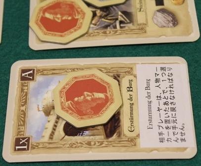 そして、このカード。 カードの上に置かれた相手のマーカーを1つ手元に戻させる攻撃的なカードだ。
