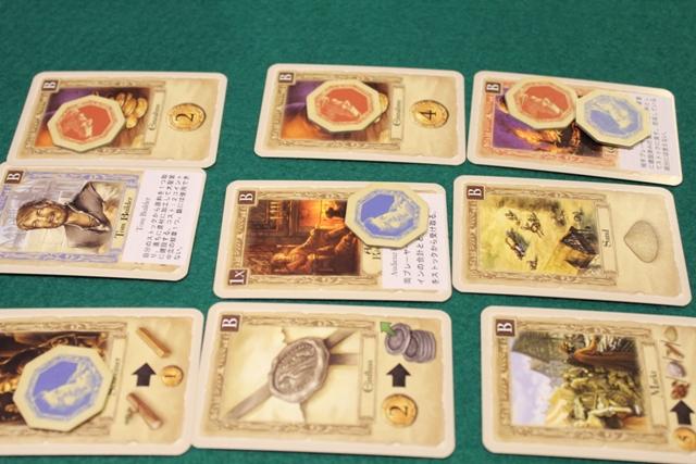 要するにこのとき、出た数字の大きい方が勝ちというわけ。 紋章チップは持っている限りいくつでも弾くことができる(数字の合計で勝負する) のだが灰色のチップは使い捨て(※負けたほうは1枚だけ手元に戻せる) なので、アクションカードでこの紋章を買い戻すことができるようになっている。 ちなみに、青と赤のチップは常に手元に戻せるのだが こいつらを弾いてしまうと、それ以降はその手番でチップを弾けなくなる。 こんな感じでそれぞれアクションカードを獲得して1枚ずつ実行して1フェーズ終了。 次のフェーズではまた新しくアクションカードを9枚めくって同じようにして獲得していく。 3フェーズで1ラウンド終了。 そして4ラウンドでゲーム終了となる。より多く建築している方の勝ち。 ただし、3ブロック先に建築したらそれでそのまま勝ちになる。
