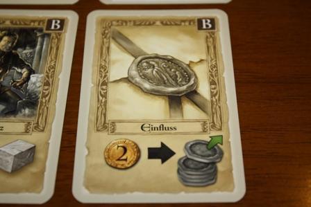 原料を取って来たり、加工したり、売買ができるマーケットなんてのもある。 中にはテキストで書かれた、特別な効果を発揮するカードもある。 その中に、お金を払うことで紋章を獲得できるカードがある。
