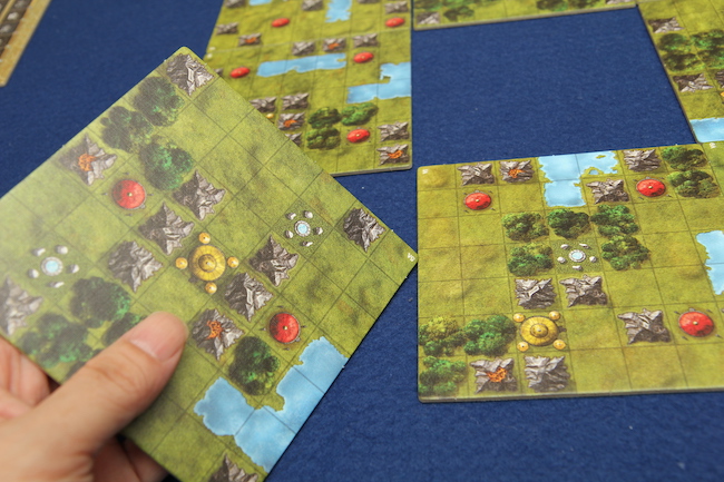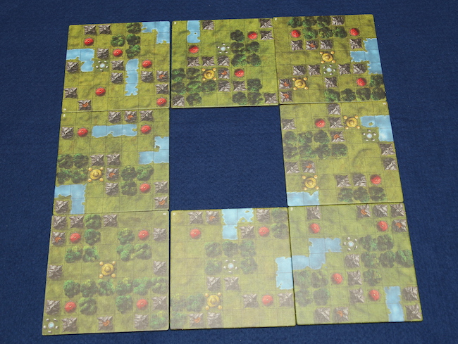 8枚のボードを3×3の形にランダムに並べます。(中央を空けておく)ボードはリバーシブルになってます。