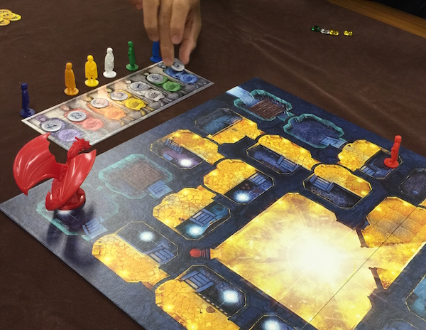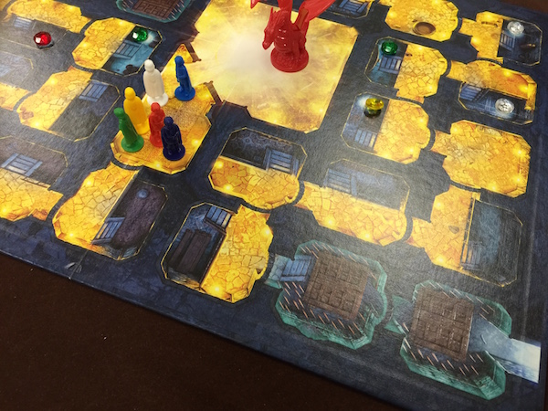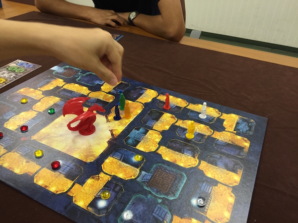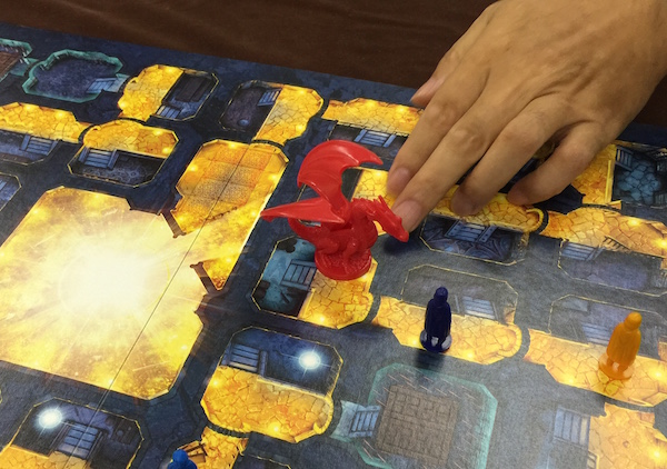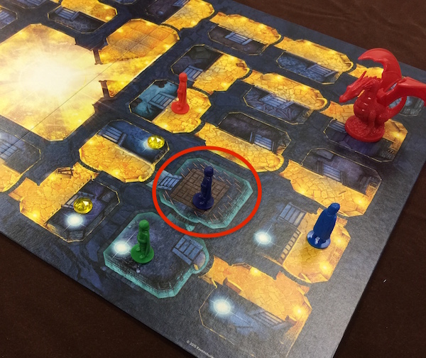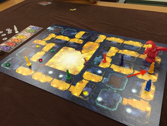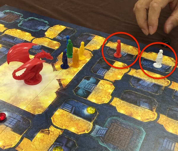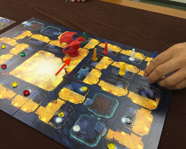 ドラゴンは最初は1マスしか動きませんが、以降は5マスずつ動きます。 ドラゴンの移動が終わったら、すべての冒険者コマを同じマスの明るい部分に出します。