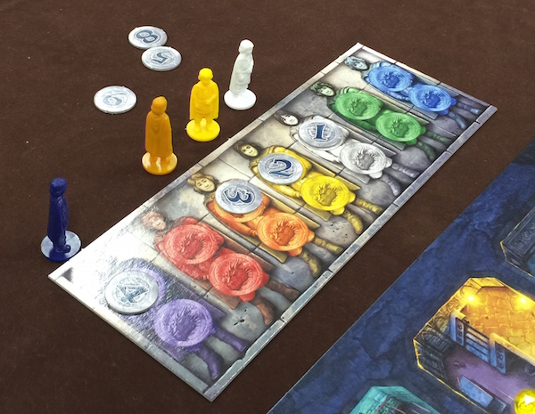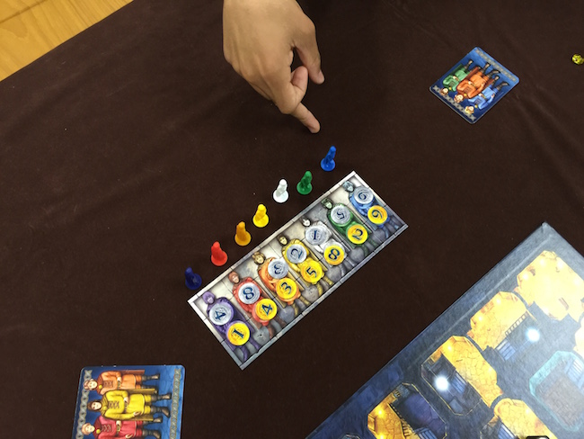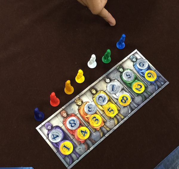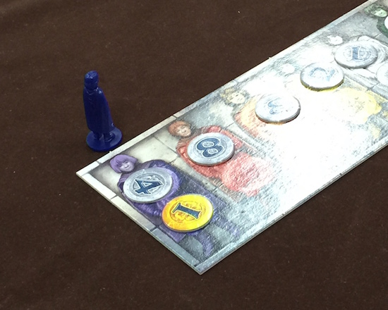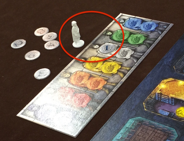 ドラゴンに追いつかれた冒険者コマはボード上から取り除かれて、得点チップが割り当てられます。 最初に捕まった冒険者コマは1点、その次は2点という感じで、早めに捕まってしまうと点数が低い。
