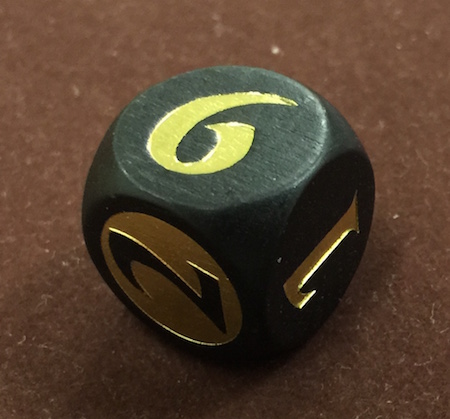 1、2、2、3、4、6 という構成になっていて 5がなく、2の目が2つあります。 基本的に、移動を終えた(マスの暗い部分に居るコマ)はもうドラゴンの移動が終わるまで動かせませんが 2の目のときだけは、暗いマスに居るコマも動かすことができます。 冒険者がどれか1つ、出口から脱出するか、全冒険者がドラゴンにつかまるかしたら1ラウンド終了。 ボードは両面仕様になっていて、2ラウンド目は裏面を使います。