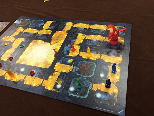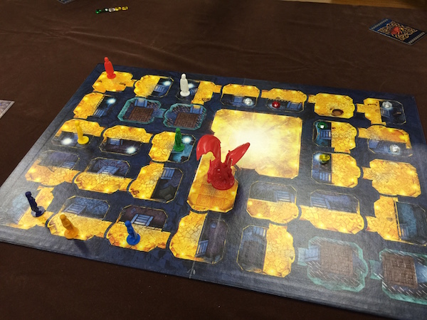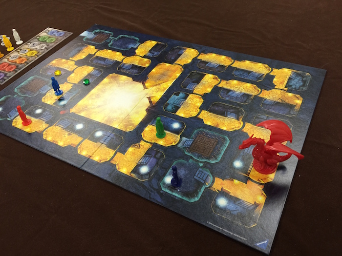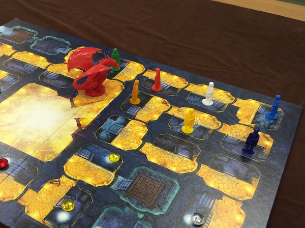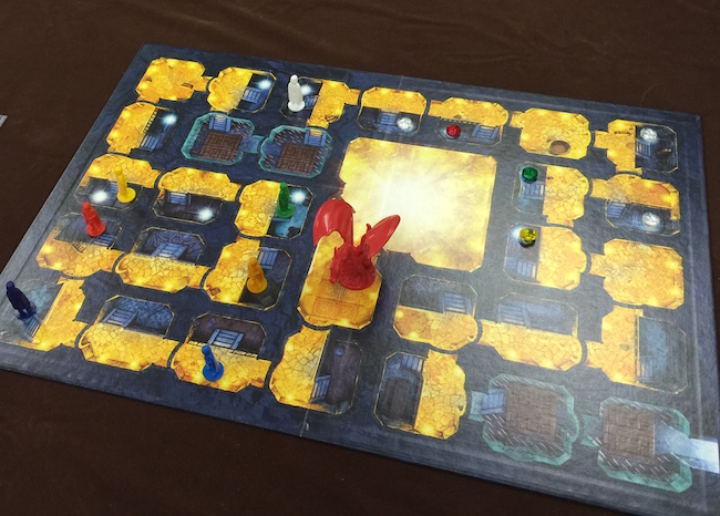 ボード全景、冒険者たちはドラゴンの巣から宝石を拾いながら出口から脱出することを目指します。冒険者たちのスタート位置はここ。となりの大部屋にはドラゴンがいます・・