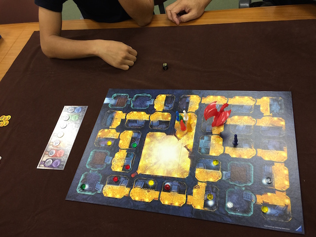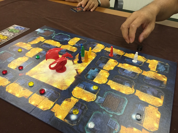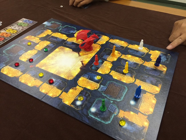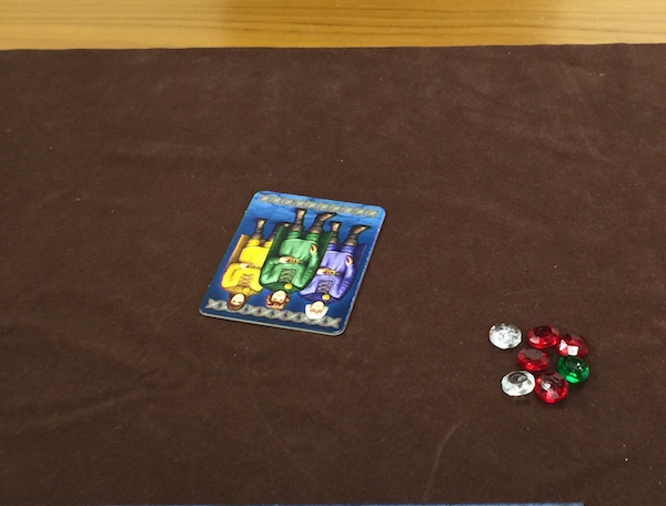 ボード上のいくつかのマスには宝石が置かれていて、宝石のマスで止まるとそれを1点としてもらえます。 このゲームでは1人1色の冒険者コマを持つのではなく、複数の冒険者コマを秘密裏に担当します。 どの冒険者を担当するかは、カードを1枚ずつ引いて決めます。