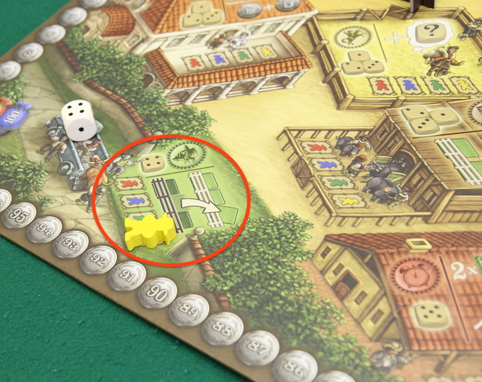 ここは、1か2か3の目を使うと、ワーカーを1つ置けます。 次のラウンド以降、ここにワーカーが置かれていると、1〜6の好きな目のサイコロとして使うことができます。 ここは、4の目で置けます。