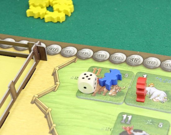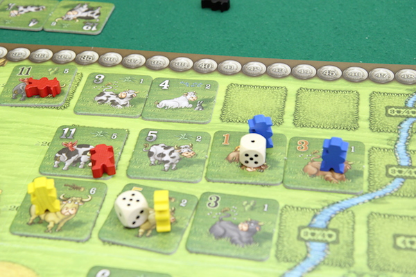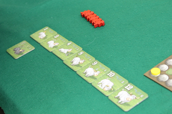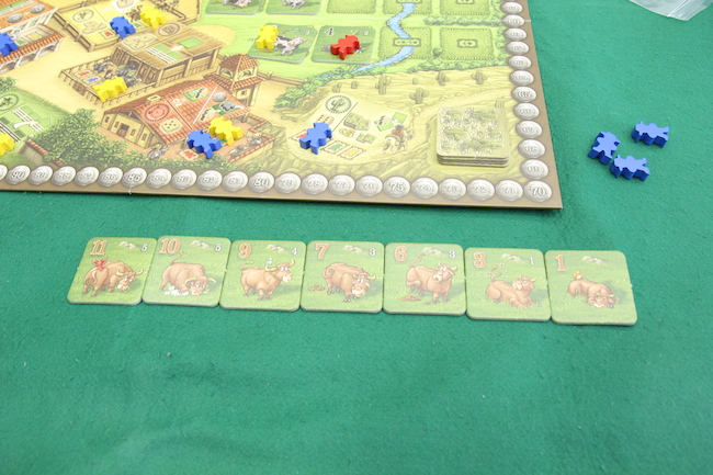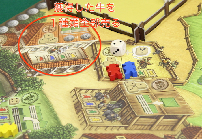 左上のアクションスペースは、牛を売って勝利点にできるアクション。 通常は、こんな牛の獲得状況で白い7の牛を獲得したら、売却するわけですが 上記のアクションスペースでは、牛タイルの獲得時以外で売却ができます。