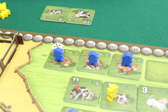 12×5=60点 ちなみに、1、3、6 と獲得しているところに5を獲得してしまったら 1、3、6は、6×3=18点で売却して、新しく獲得した5は新しい列の1枚目として自分の前に置きます。 牛タイルを獲得するには、ボード上に並べられた牛タイルの上にコマ(ワーカー)を置く必要があります。