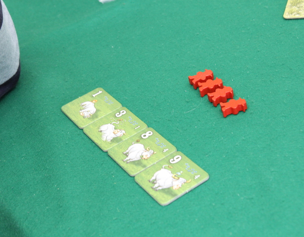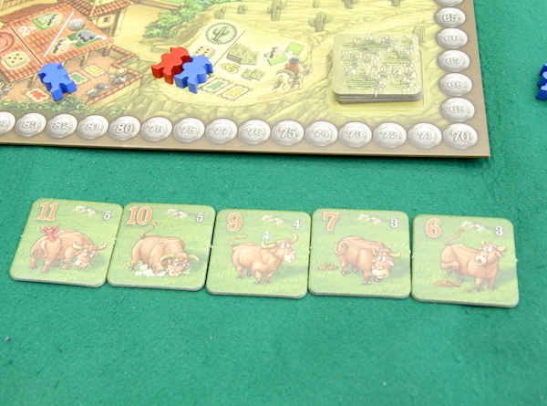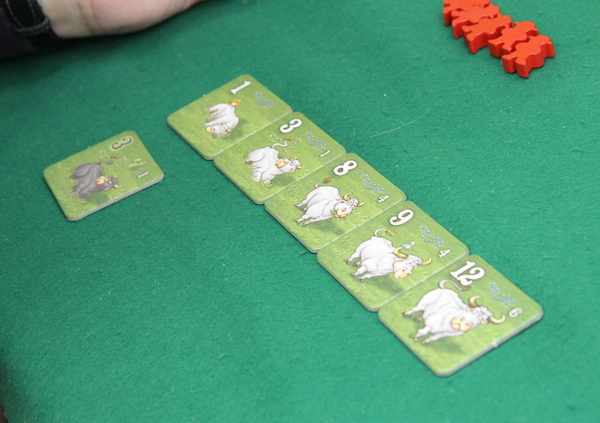 牛は色ごとに1〜12までの数字が付いていて、それぞれ1枚ずつ。 つまり1色につき12枚あります。 とりあえず、数字が大きい牛が方が価値が高くなります。 獲得した牛タイルは、ケルトみたいに牛の種類ごとに 昇順か降順に自分の前に並べます。
