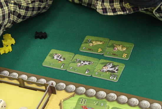 6の目のアクションスペースの効果は、けっこう強力で ここには4枚の牛タイルが伏せられていて、アクションの効果を発動したら4枚の中から好きな1枚を選んで ワーカーを立てた状態でボード上の好きな牛タイルの列に加えられます。