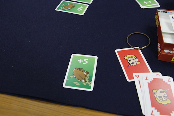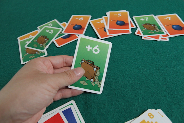 この場合も、出した数字カードの合計がもっとも大きいプレイヤーがマイナスカードを獲得します。 ■次のラウンド 得点カードの山札から最初と同じように、テーブル中央にプレイ人数+1枚並べて次のラウンドに入ります。 数字カードはすべて各プレイヤーの手札に戻されます。 並べる得点カードが足りなくなったらゲーム終了。