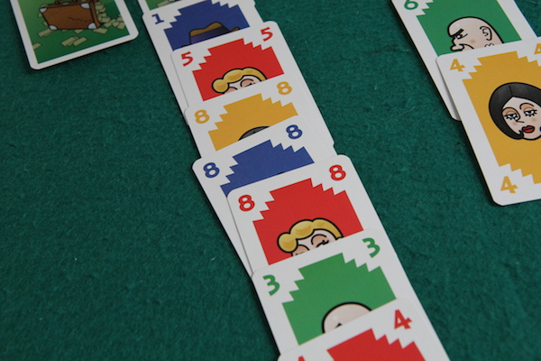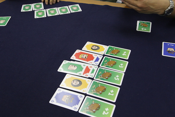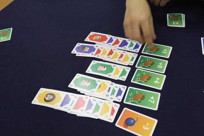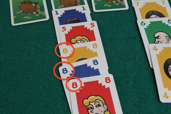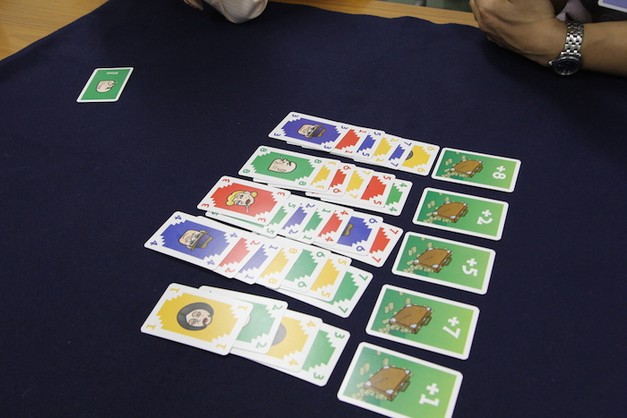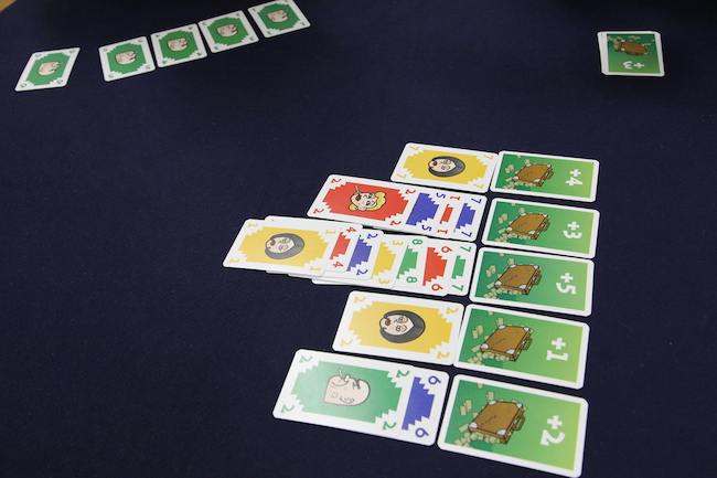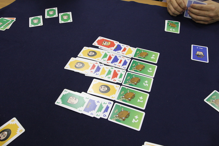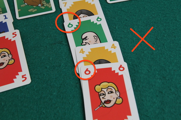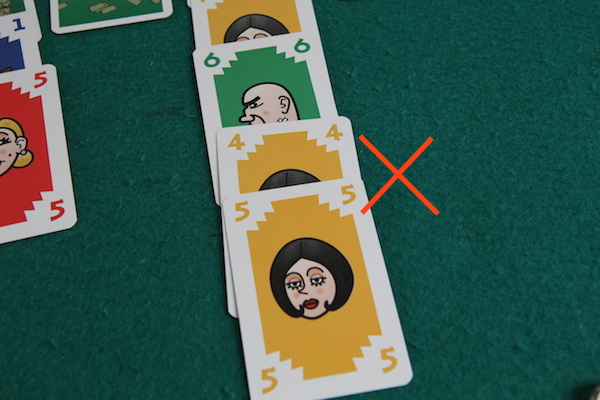 ただし、カードの出し方にいくつか制約があります。 まず、1つの列に対して同じプレイヤーのカードを連続で置くことはできません