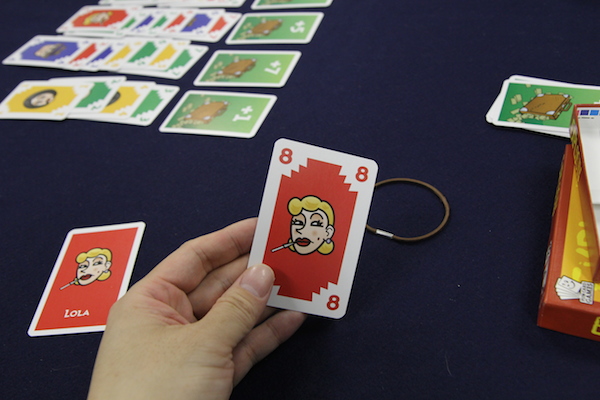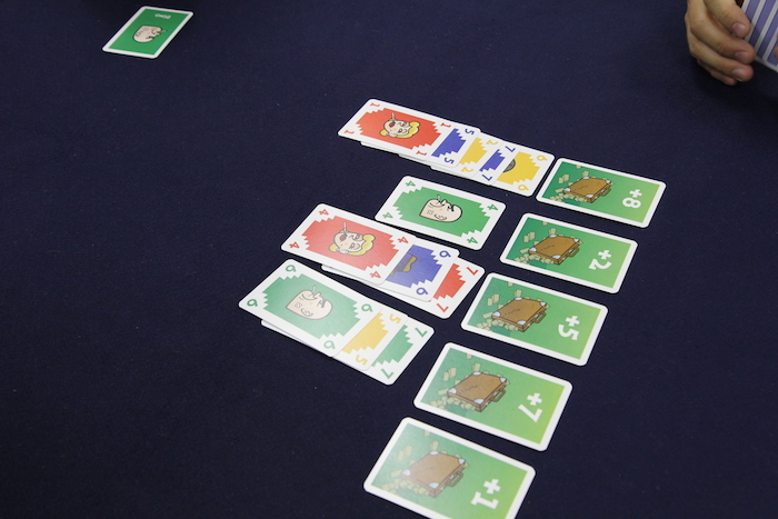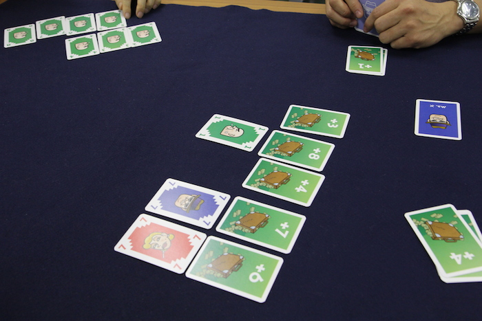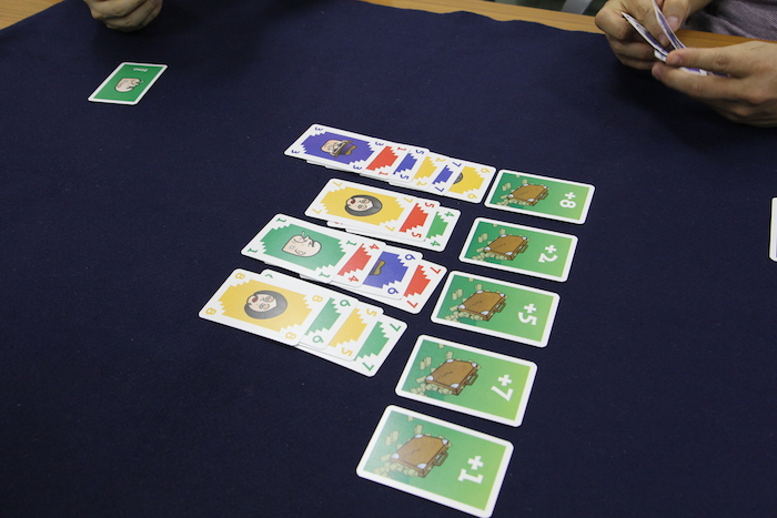 8は重ねられるので、1枚しか出せないなかで最大の数字の7をとりあえず本命の得点カードの列に置く