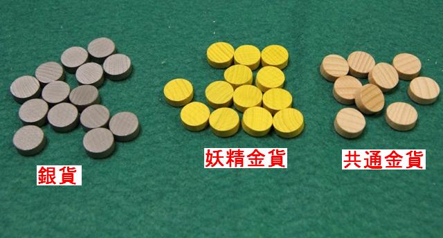 一斉入札式の競りゲームです。 競りにはお金が必要ということで、基本的に3種類あります金貨が2種類あるのだが、価値としては同じ。 ただし、妖精金貨の方は使っても後で戻ってくる。 それに対して、共通金貨の方は使いきり。 という違いがあります。 で、何を競るのかというと、3色の宝石たち