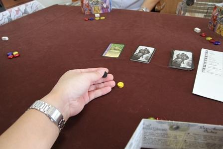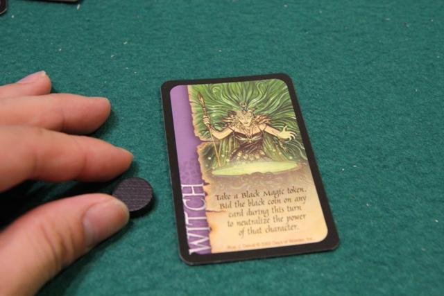 最初に競るカードは必ずウィッチから。 理由はウィッチの特典で獲得できる黒魔術コインは、このラウンドでしか使えないから。 ラウンド終了時に未使用の黒魔術コインはストックに戻さなければならない。 2枚目以降は、山札の上からめくっていきます。