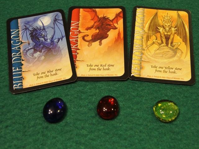 カードには、競りに勝ったとき得られる特典が書かれています。 まず、3色のドラゴンカード