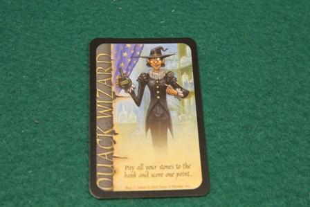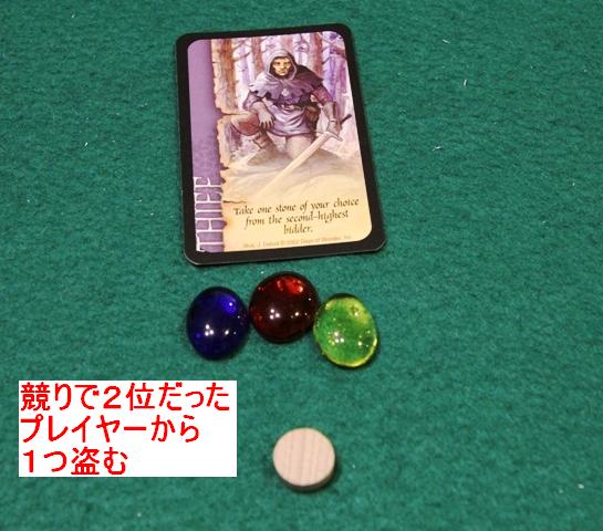 このカードを競り落としたプレイヤーは、競りで2位だったプレイヤーから宝石や金貨を1つ盗むことができます。 2位が複数居る場合は、その中から任意の1人を選びます。 ※その中に宝石を持っているプレイヤーが居る場合は、そのプレイヤーを優先的に選ばなければならないなど ちょっといろいろ制約がある 最後にウィザード