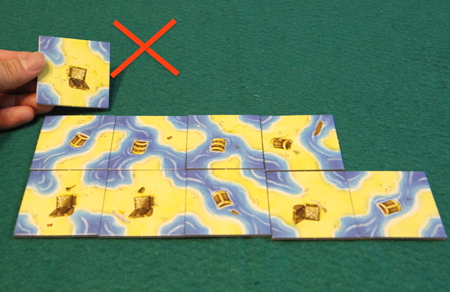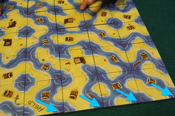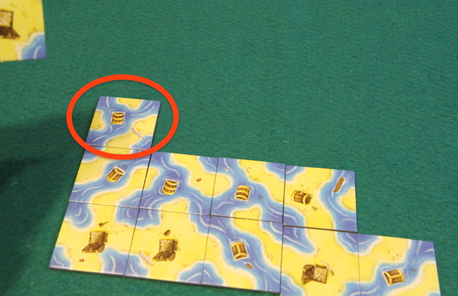 コンポーネントはタイル36枚だけ。 タイルを1枚ずつ、6×6に並べたらゲーム終了。で、並べ終わった時に、赤い線が相手側、青い線が自分側という区別というか決めがあって、ルール上これがちょっと意味を持ちます。 いくつかのタイルには宝箱が描かれています。 ゲーム終了時に自分側から陸路だけ、もしくは水路だけで到達可能な宝箱を獲得できます。