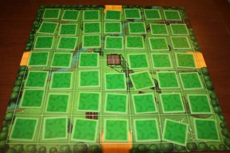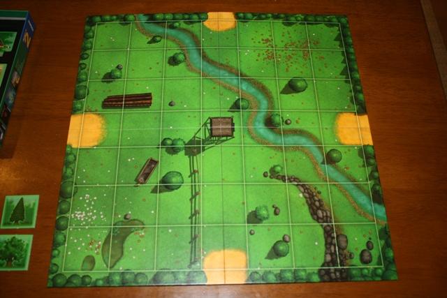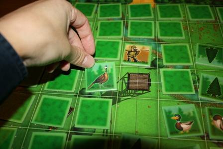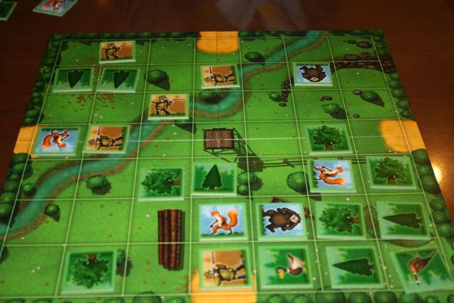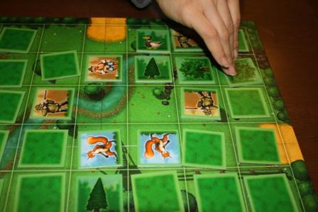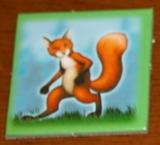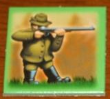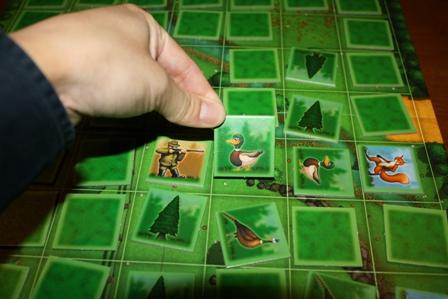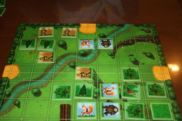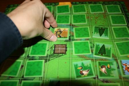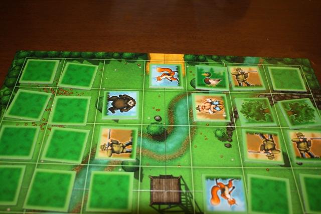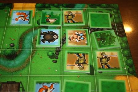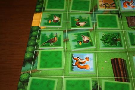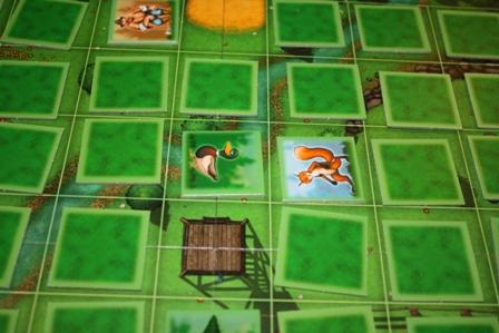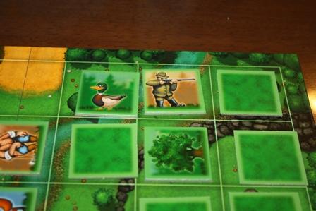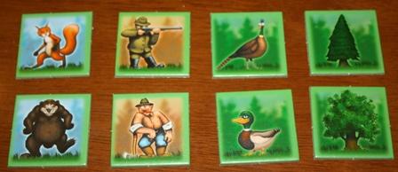 クマ、キツネ、キジなんかの動物とかハンター、きこりなど。 木なんかもある。 プレイヤーは、クマ・キツネチーム(水色のタイル)と ハンター・きこりチーム(茶色のタイル)に分かれて 獲物を狙います。 背景が緑のタイルは、中立のタイル。 んで