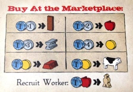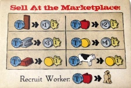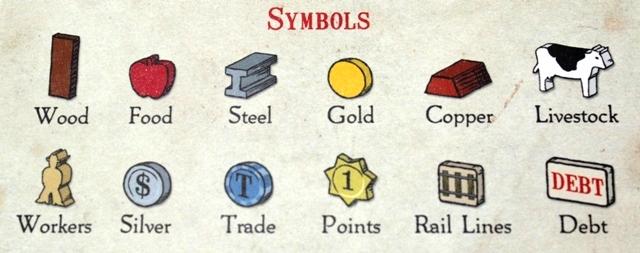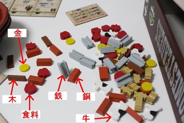 たくさんのリソース(資源)を元に勝利点を稼ぐゲームです。木材、鉄、銅、金、食料、牛・・・ これが一覧
