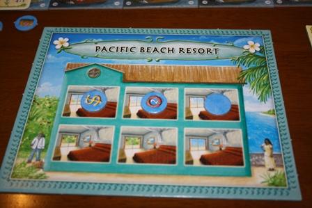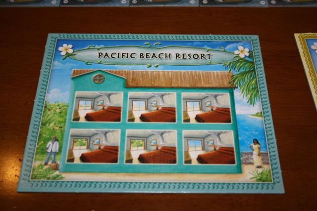 リゾート地サモア。 各プレイヤーはホテルのオーナーになって お客さんに泊まってもらいお金を儲けます。 これがホテルボード。部屋は6個。1人1枚ずつ持ちます。ちなみにホテルのデザインは1つずつすべて違っていて部屋の内装も全部違う。