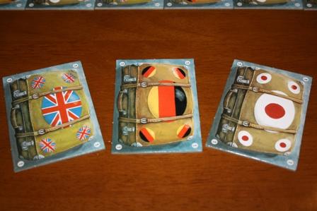 イギリス、ドイツ、日本・・ このタイルは全部で12枚あって、各ラウンドごとに1枚使う。 そのタイルの国から飛行機が来たことになってて 新たなお客さんが到着すると同時に、その国から来ているお客が帰っていく。 つまり、ゲームは全12ラウンドで構成される。 このタイルを適当に1列に並べる。