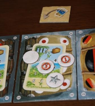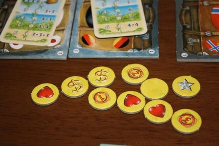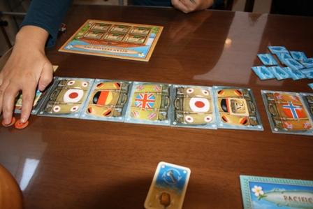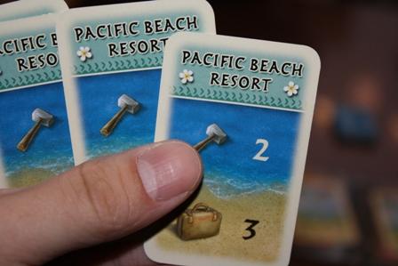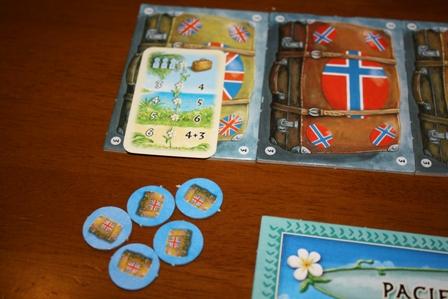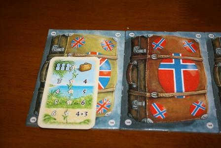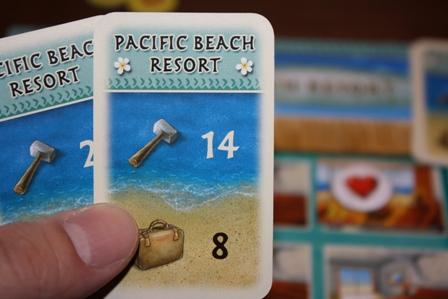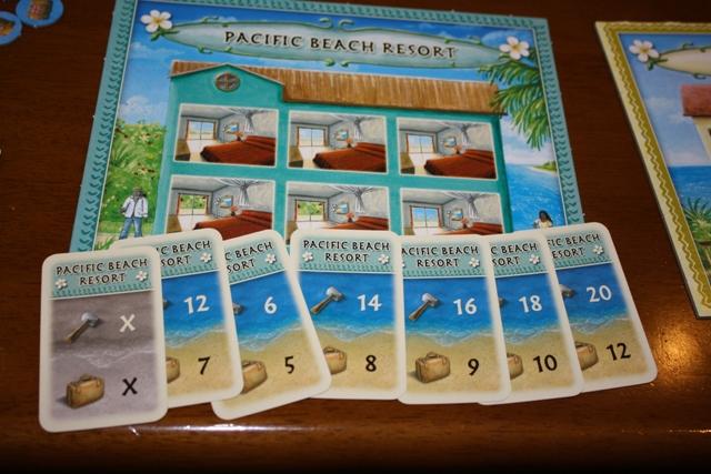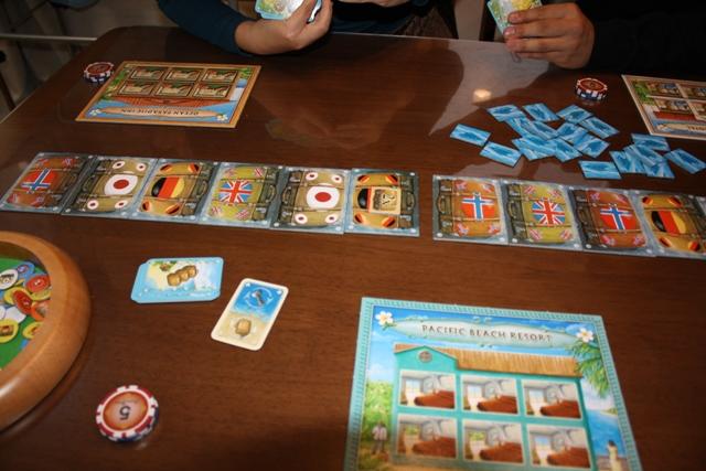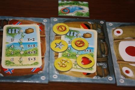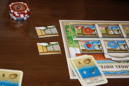 カードには数字が書かれていて、これが宿泊料金 一番安い値段を付けた人のホテルにお客さんは訪れる。 カードは基本的に使い捨て、いつどのくらいの料金設定にするかが 勝負の分かれ目となる。 ホテルは6室しか無いので、満室なら当然新たな客は泊められない。 しかも次に自分の国に帰る飛行機が来るまで居座り続けるので 場のタイルを見ながら計画的に客を泊めるようにしなければならない・・ 見事落札?できたら、落札代金をもらって旅行客チップを自分のホテルに置きます。