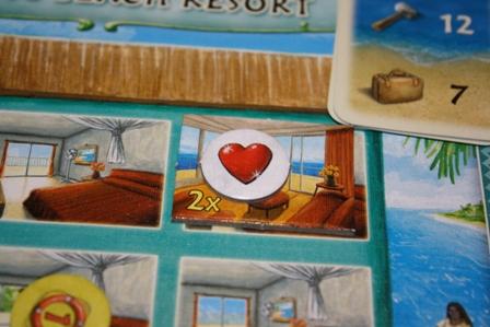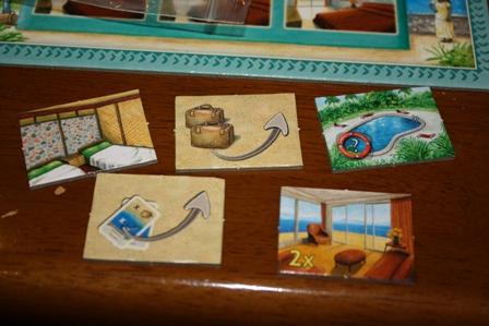 お客さんにもいろいろ居て、お金持ちの客は、より多くのお金を落としていってくれたり 恋人同士は同室に泊められたり、けっこうバラエティー豊か。 ところで、競りを行うときに使うカードには数字が2つ書かれていて 1つは宿泊料金なのだが、もう1つは設備投資。 一番高い値段を付けた人から、設備タイルを取ることができる。
