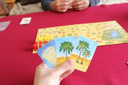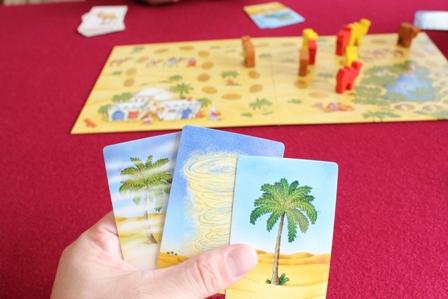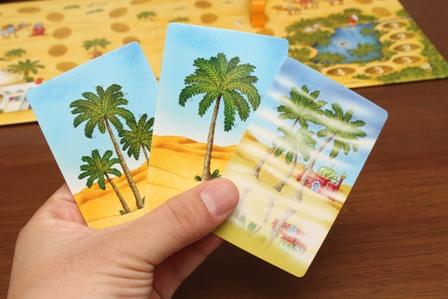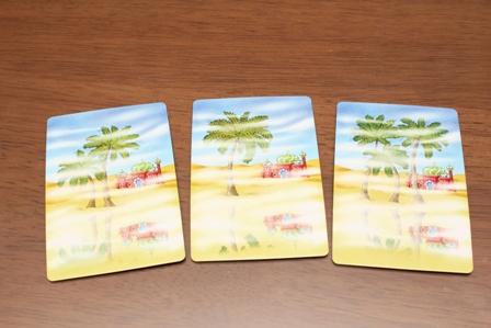 これらのカードをプレイしたら、自分のラクダを1つ選んで ヤシの木の数だけコマを進めます。 オアシス内のラクダも進められますが、カードの移動ポイントは余らせてはいけない 次に、蜃気楼のカード3枚