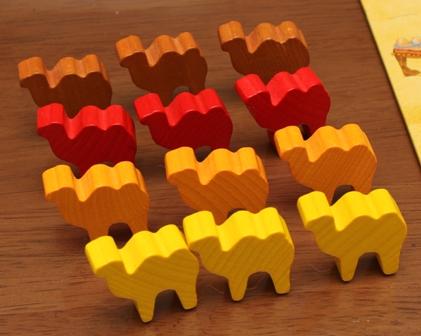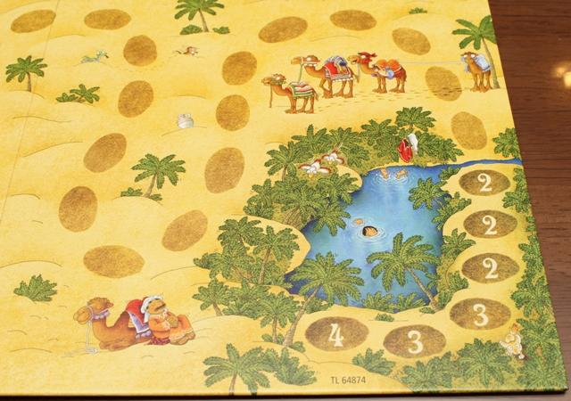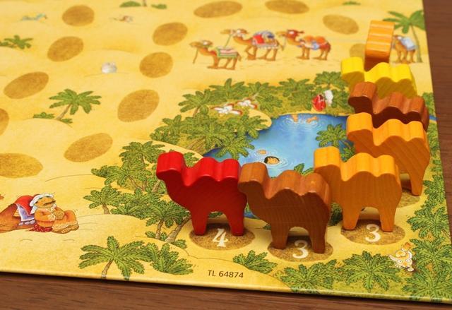 オアシス内には6マス分のスペースがあり、得点が付いています。 要するに、できるだけ早くできるだけオアシスの奥へ、コマを進めるのが目的 そのコマというのが、このラクダ。1人3個ずつ持ちます。