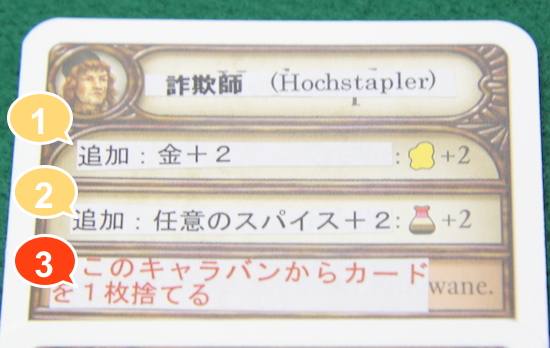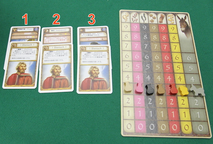 この2点の勝利点カードなら、ラマ2つを持っている必要があり、さらに 黒リソース2、黄土色リソース1、ラマ1を消費する必要があります。 使ったら、個人ボードのマーカーを下げます。