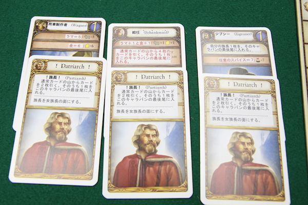 手持ちのリソース量を表す個人ボードと、カード2枚のカードデッキを3つ 最初に受け取ります。3つのカードデッキをうまく回していって、 1.リソースの獲得 2.リソースを勝利点に変える ということを繰り返していきます 最初に25勝利点獲得したプレイヤーの勝ち 初期デッキの一番上は全て族長カードというちょっと特殊なカードです。