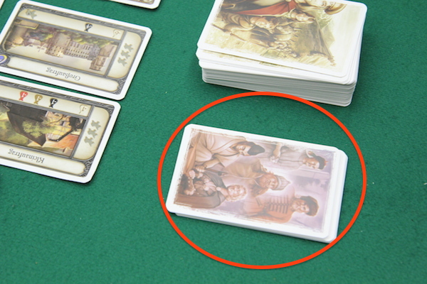 ちなみに手札は持ちません。3つのデッキは常に見える状態で、自分の前にオープンにしておきます。 勝利点カード、常に4枚オープンにして獲得されたら山から補充します。