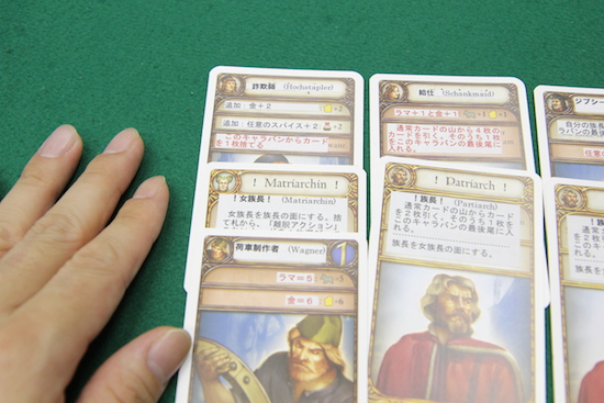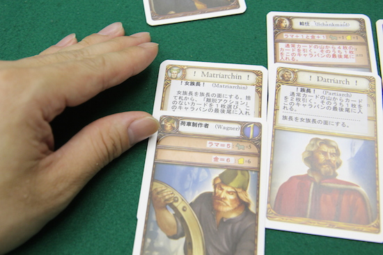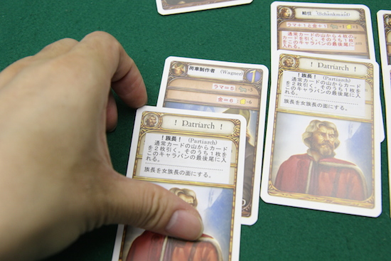族長カードの効果は、カード山から2枚引いて1枚を捨て札、1枚をデッキの1番後ろに入れるというものなので こうなります。※族長カードだけはちょっと特殊で、使ったら裏返して(女族長の面を上にして)からデッキの一番後ろに入れます。