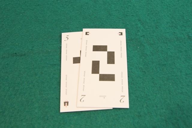 んー、このシステムで何を魅せたいのかがイマイチ伝わってこない。。 読みの手がかりになる情報が少なめだし、ブラフゲーとかでもなさそうだし、 リソースマネジメントとかハンドリングのようなタイプとも違うように思う。 足し算がちょっと面倒に感じてしまうくらい、ボヤっとしたプレイ感だった。 ヤギ戦争みたいなドボンを前面に持ってくるなら 「もしドボンしてしまったら負け」というような類の緊張感がたぶん必要だし ハゲタカの餌食のような心理戦にするのなら、初期手札は同じであった方がいいのかな?と思ったり。 ※その場合は、場に出すとき伏せて出すようにするとか カードを余らせずに3人~対応にしてしまえば、オープンでもいけるかな あと、ノックの宣言に関してはオプション選択にするというのが良いかも。 つまり手番でできることは、①カードを出す、②カードを場から拾う、③手札の6を捨てる 3つの中から1つを選んだ後、ノック宣言するかどうかを決められるようにするというのはどうだろうか? 相手の手を受けて、勝負するかどうかを選択するよりは 自分の打った手で勝負できた方が面白いような気がするんだけどな。 足し算以外のプレイアビリティに関してはとても良いと思う。 さっと出して気軽に遊べる。 ****** カードというよりはタイルに近くて、非常に質感のいい素材。 汗を吸ってしまいやすそうな感触なのが敢えて言えば気になった。 そういうのが良い味になってるとも思うんだけど。 2013/05/06ツイート