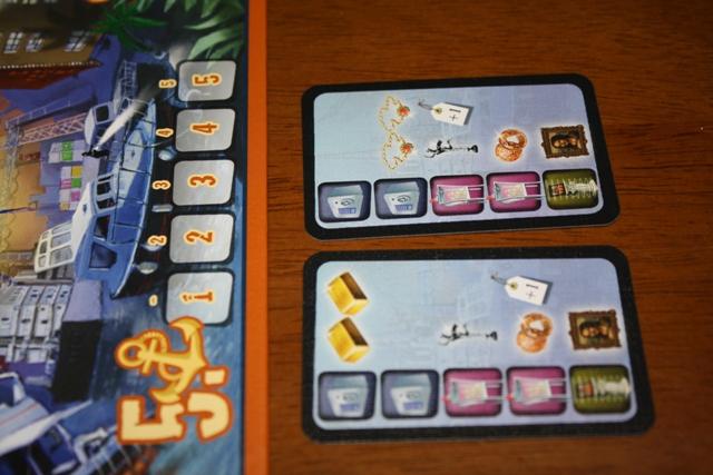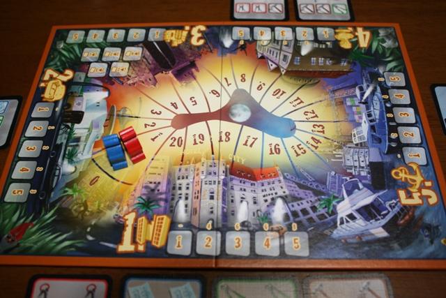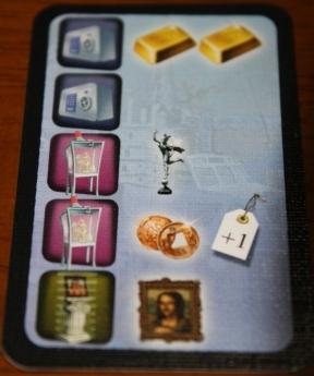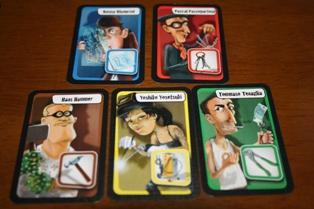 プレイヤーは悪党になって盗みを働き、盗んだ品を換金して勝利点を得ます。 5人の悪党たち。それぞれ盗みに関する特技を持っている。ゲーム中、1人1枚ずつ持ちます。 ゲーム全景。中央が勝利点(得たお金)のスコアトラック。